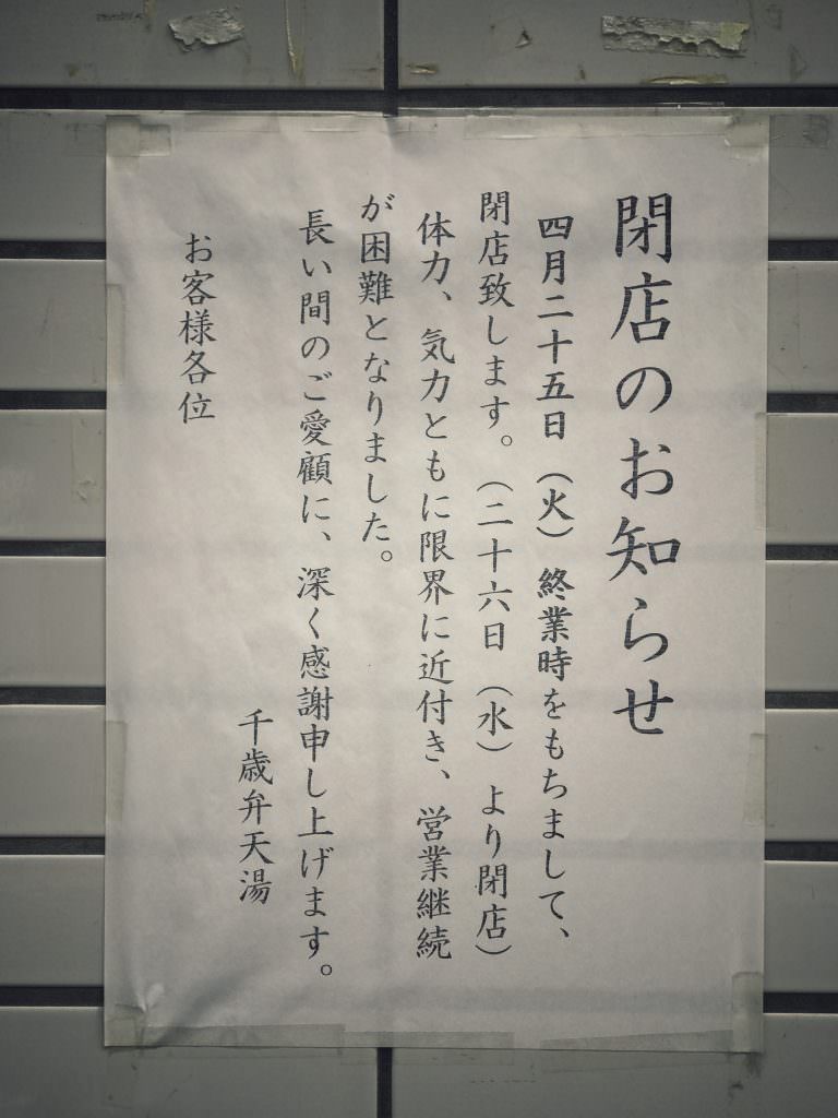 創業は明治15年の老舗銭湯が廃業になったようです。 これで森下駅から半径700m以内の銭湯は「ときわ湯」1件になりました。 すごく残念です。 でも、この張り紙の文章を読んでいると、とても寂しい気分になります。 近頃では銭湯を上手くリノベーションしている例もあるので、場所だけでも残ってほしいなと思っています。 弁天湯