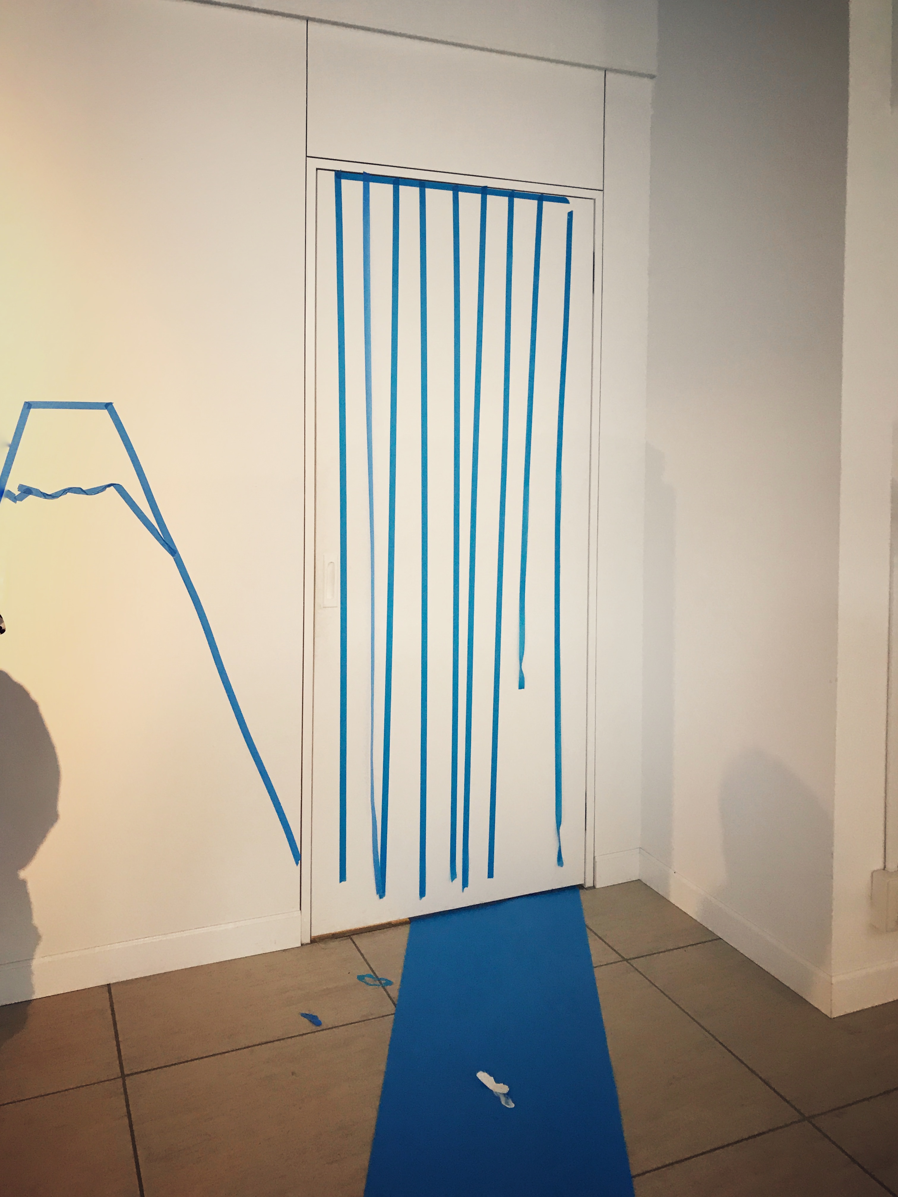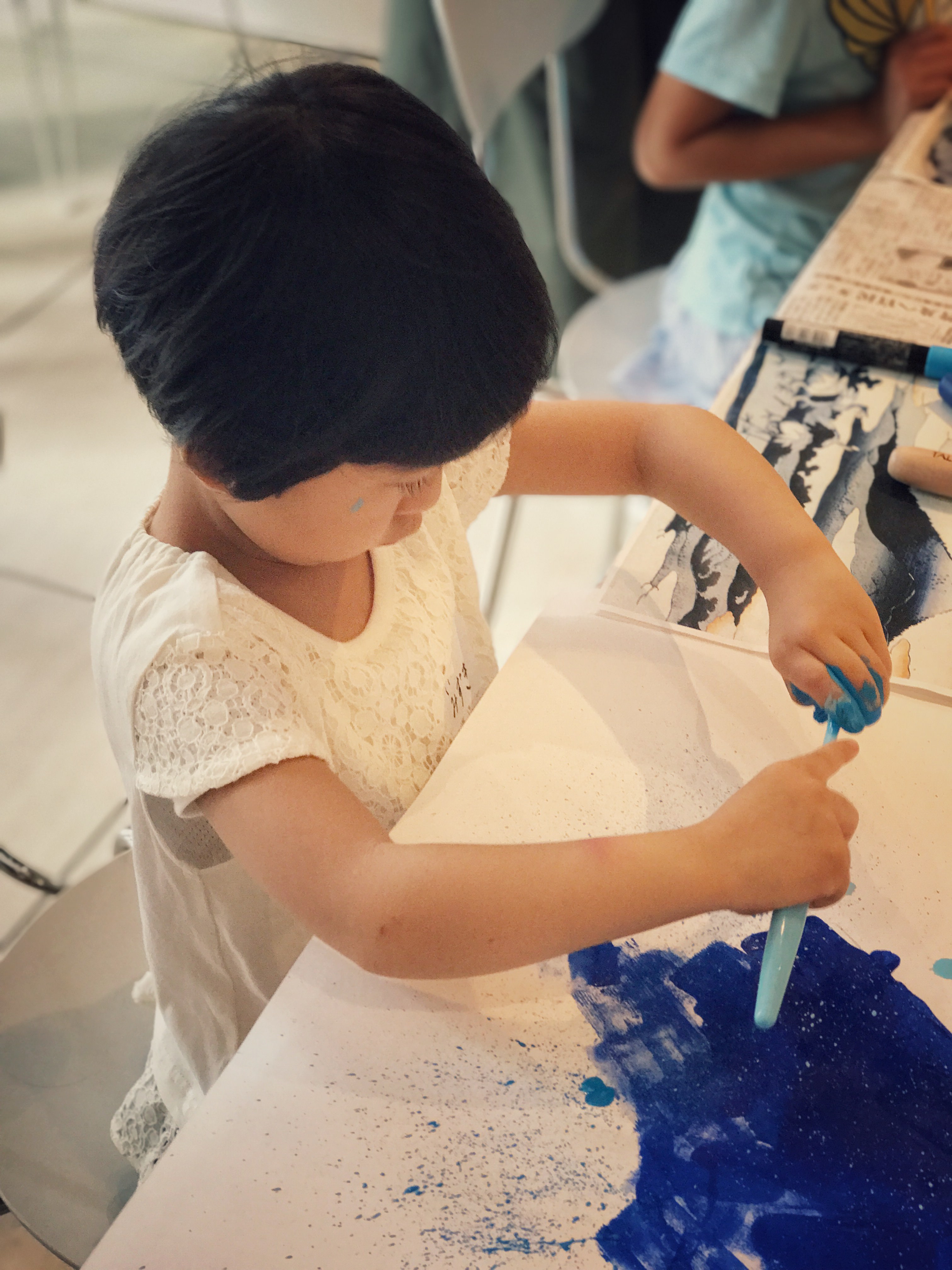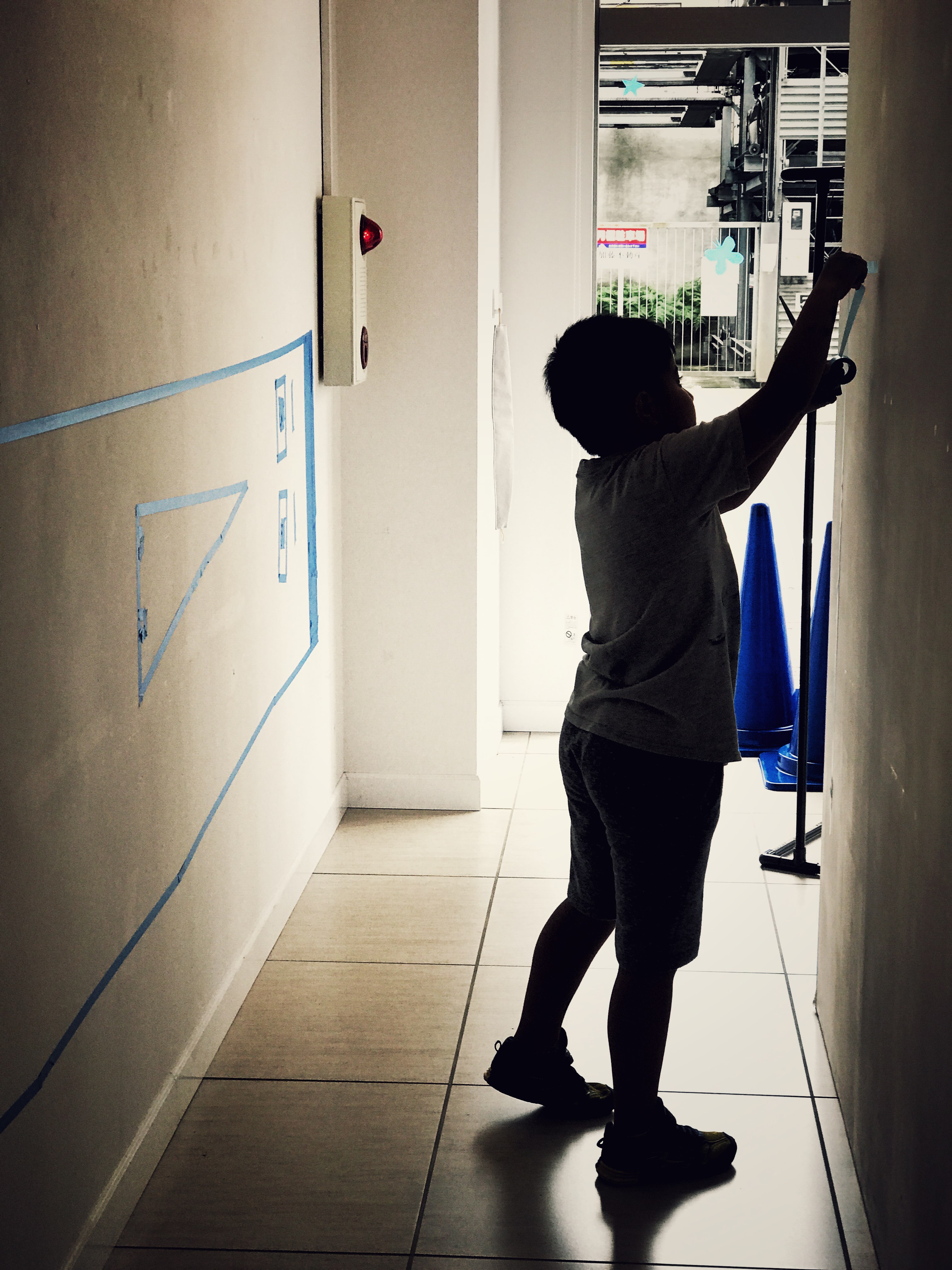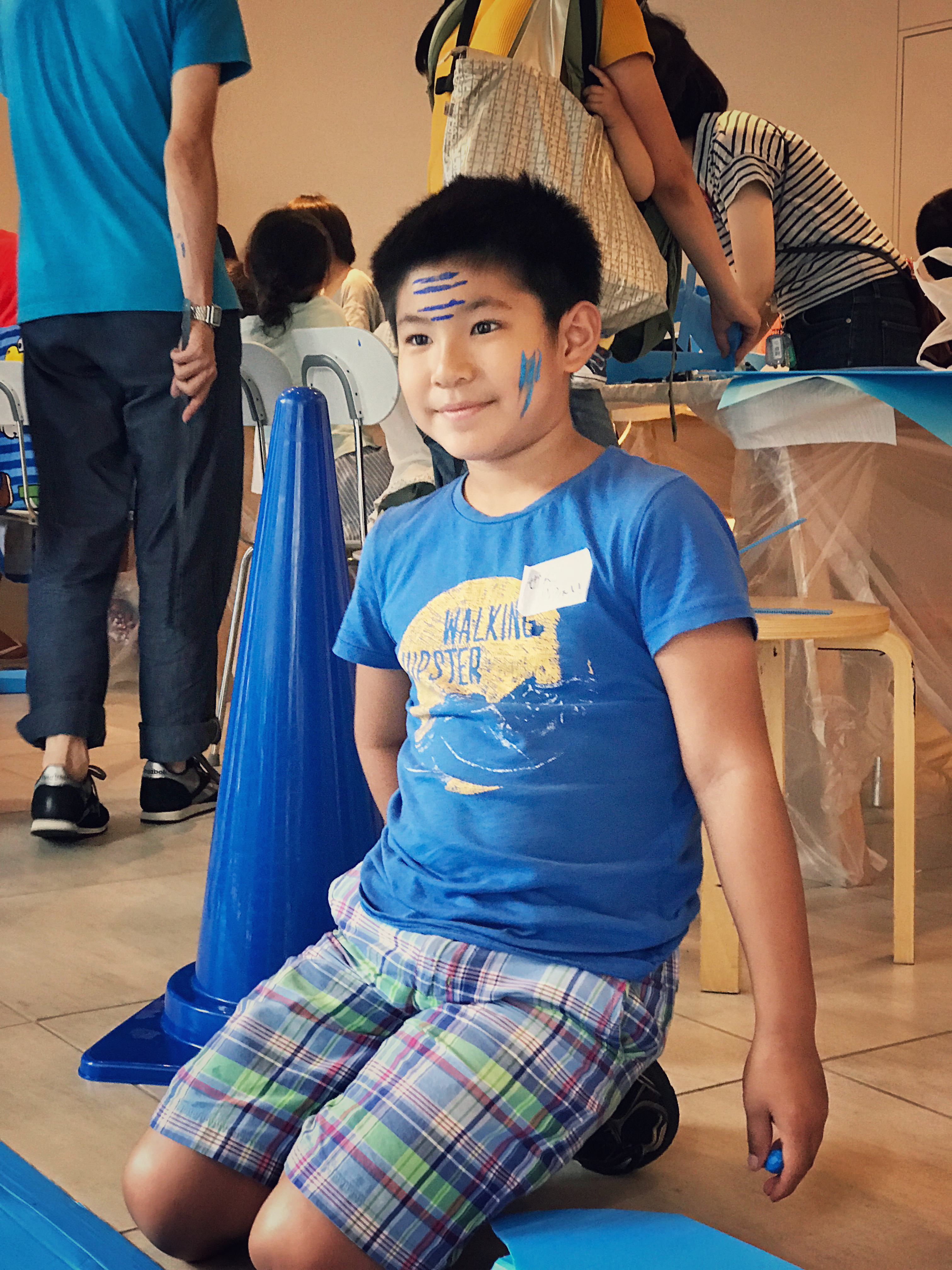最後には、手を真っ青に染めてしまう子、自分の顔に落書きを始める子、壁にマスキングテープで絵を描く際には、巨大な顔を描いていました。