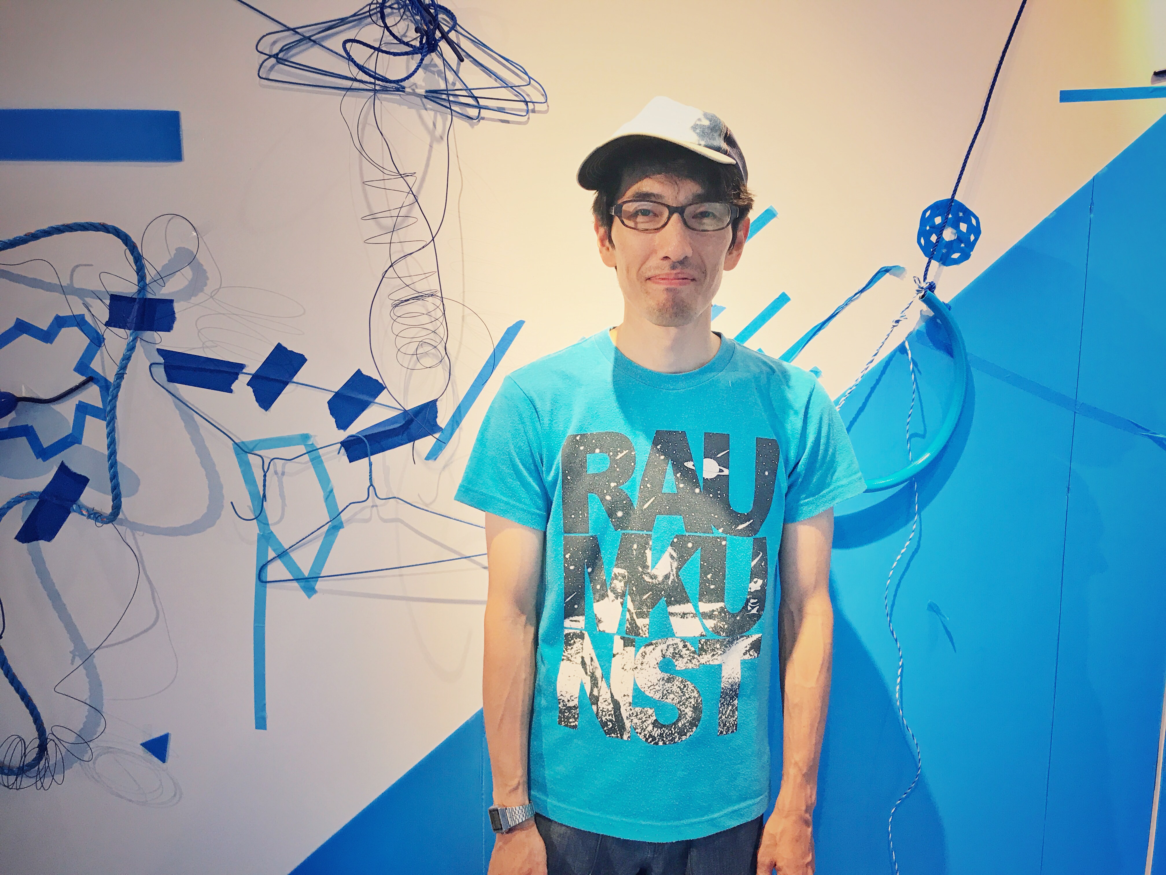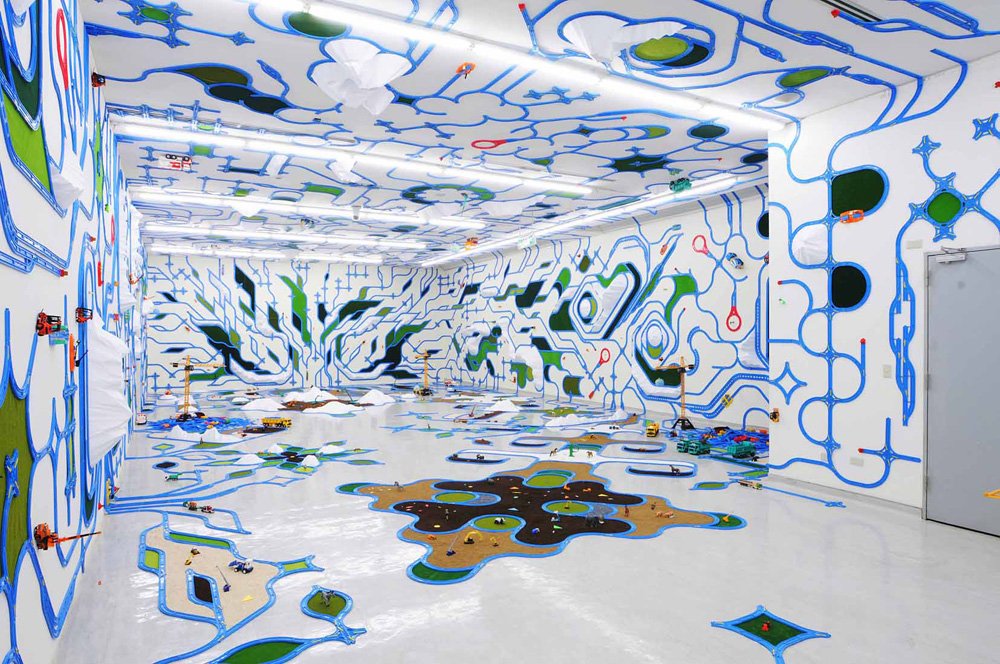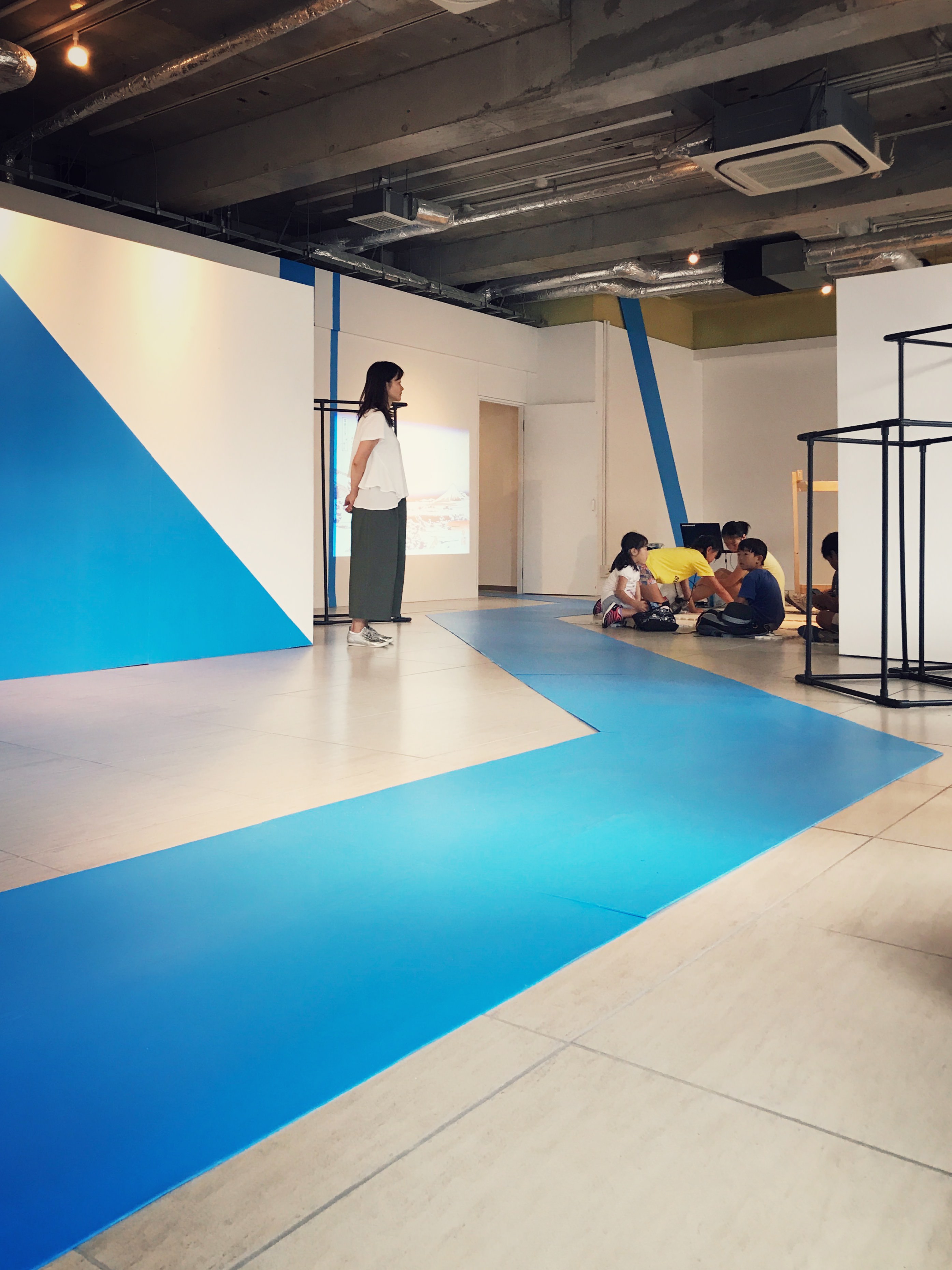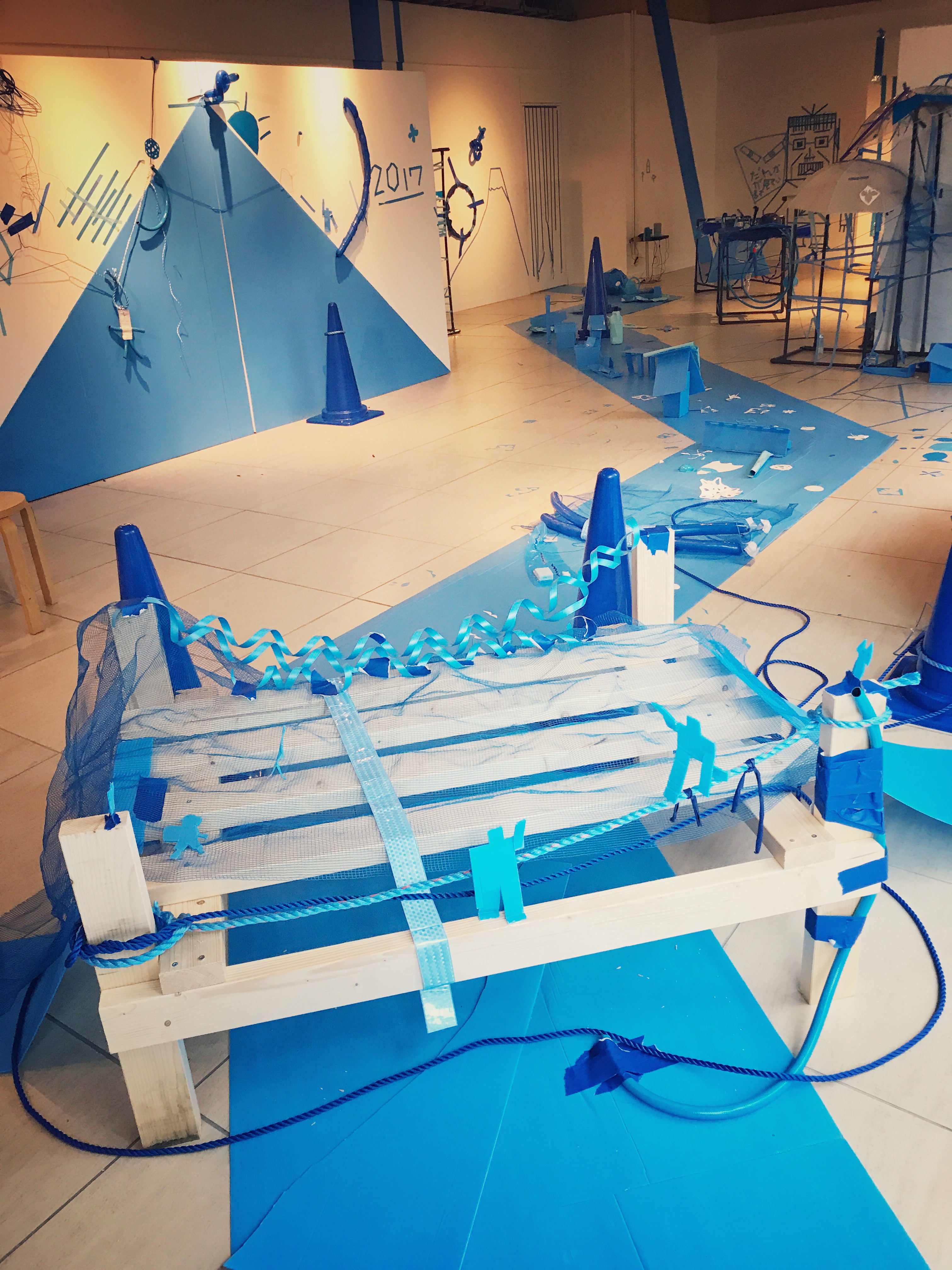 レジデンスを訪れると青いプラダンと無機質なパイプで作られたオブジェが並んでいました。これが最後には、山や川そしてビルにみえる不思議な街になります。